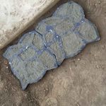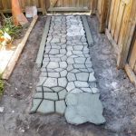 I love this stone walkway mold. It is so simple to use. Each side has either an "out" or "in" pattern. Simply match your next section so it interlocks. Turn your pattern 1/4 turn each time to achieve a more random look. Curves are simply made by aligning the mold to the last poured section, pressing the mold down, remove mold, and remove excess concrete. To make sure these look like random stones, use a trowel to smooth out the sharp edges. I have used both soil and gray-colored mortar to fill in the spaces between the 'stones'.